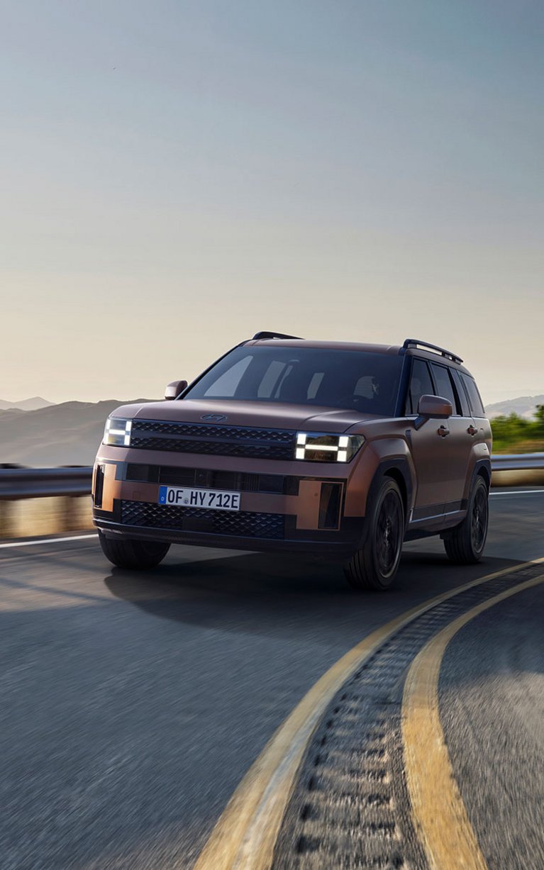 Die H-förmigen Scheinwerfer harmonieren mit der markanten Frontpartie und interpretieren das “H”-Emblem von Hyundai. Ein beeindruckender erster Eindruck. Der verlängerte Radstand ermöglicht eine kraftvolle Dachlinie und markante Radkästen mit 21-Zoll-Rädern, was dem SUV ein starkes und robustes Erscheinungsbild verleiht.